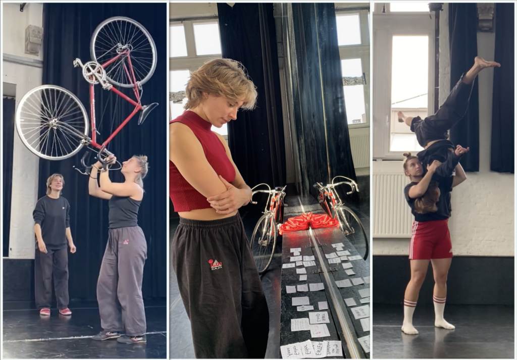 With this work, we want to explore the expressive, playful, and sonic potential of an ordinary bicycle in performance. At the heart of the piece: a bike, a microphone, a loop-station and two acrobats. Our aim is to create a playful outdoor circus performance of around 15 minutes, suitable for a 360° stage/ circular audience. Through floor- and partner-acrobatic movement, physical theatricality and play, the performance will take shape and the bike will slowly come alive, as our third performer on stage.